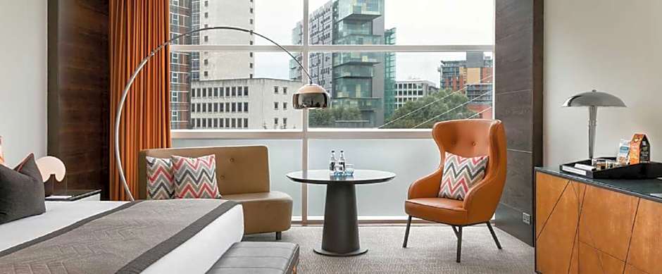 Modern room, 35sq yards, with a super king-size bed, 50-inch plasma TV and an en-suite Italian porcelain bathroom, with a walk-in rain forest shower. Our Deluxe King Rooms have floor to ceiling windows, overlooking the city of Salford. All guests will benefit from features such as a well-stocked in room bar, walk in dressing rooms, security safe, portable professional hairdryer, iron and ironing board and plentiful storage space. All have modern style walk-in rain forest shower, slippers, fluffy bathrobes, and towels to complete your stay. Our King beds are zip and link beds, which can be made up as a Twin or a Double bed. If you require a Twin bed, please message the hotel directly.